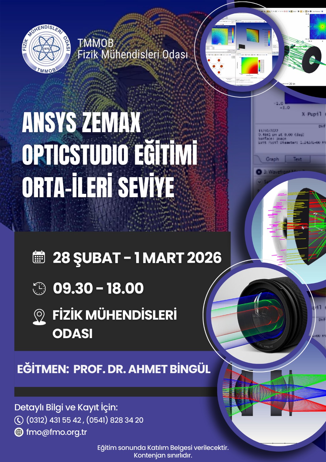 Odamız tarafından 28 Şubat-01 Mart 2026 tarihlerinde Prof. Dr. Ahmet BİNGÜL tarafından Ansys Zemax Opticstudio Orta-İleri Seviye Eğitimi gerçekleştirilecektir. Eğitim sonunda katılım sertifikası verilecektir.