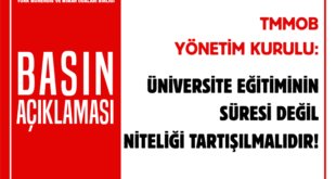ÜNİVERSİTE EĞİTİMİNİN SÜRESİ DEĞİL NİTELİĞİ TARTIŞILMALIDIR! 20.01.2026 TMMOB Yönetim Kurulu, YÖK Başkanının üniversitelerdeki dört yıllık lisans programlarının süresinin kısaltılmasına yönelik çalışma içinde olduklarını duyurması üzerine 20 Ocak 2026 tarihinde konuya ilişkin “Üniversite Eğitiminin Süresi Değil Niteliği Tartışılmalıdır!” başlıklı bir basın açıklaması yaptı. Ayrıntılı bilgi için… https://www.tmmob.org.tr/icerik/universite-egitiminin-suresi-degil-niteligi-tartisilmalidir