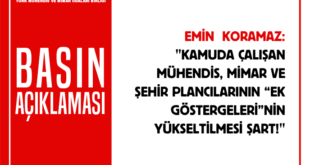 KAMUDA ÇALIŞAN MÜHENDİS, MİMAR VE ŞEHİR PLANCILARININ “EK GÖSTERGELERİ”NİN YÜKSELTİLMESİ ŞART! 18.02.2022 Kamu çalışanlarının ek göstergelerine ilişkin Çalışma ve Sosyal Güvenlik Bakanı başkanlığında düzenlenen Ek Gösterge Komisyonunun ilk toplantısı üzerine TMMOB Yönetim Kurulu Başkanı Emin Koramaz tarafından kamuda çalışan mühendis, mimar ve şehir plancılarının talepleri hakkında basın açıklaması yapıldı. Haberin more »