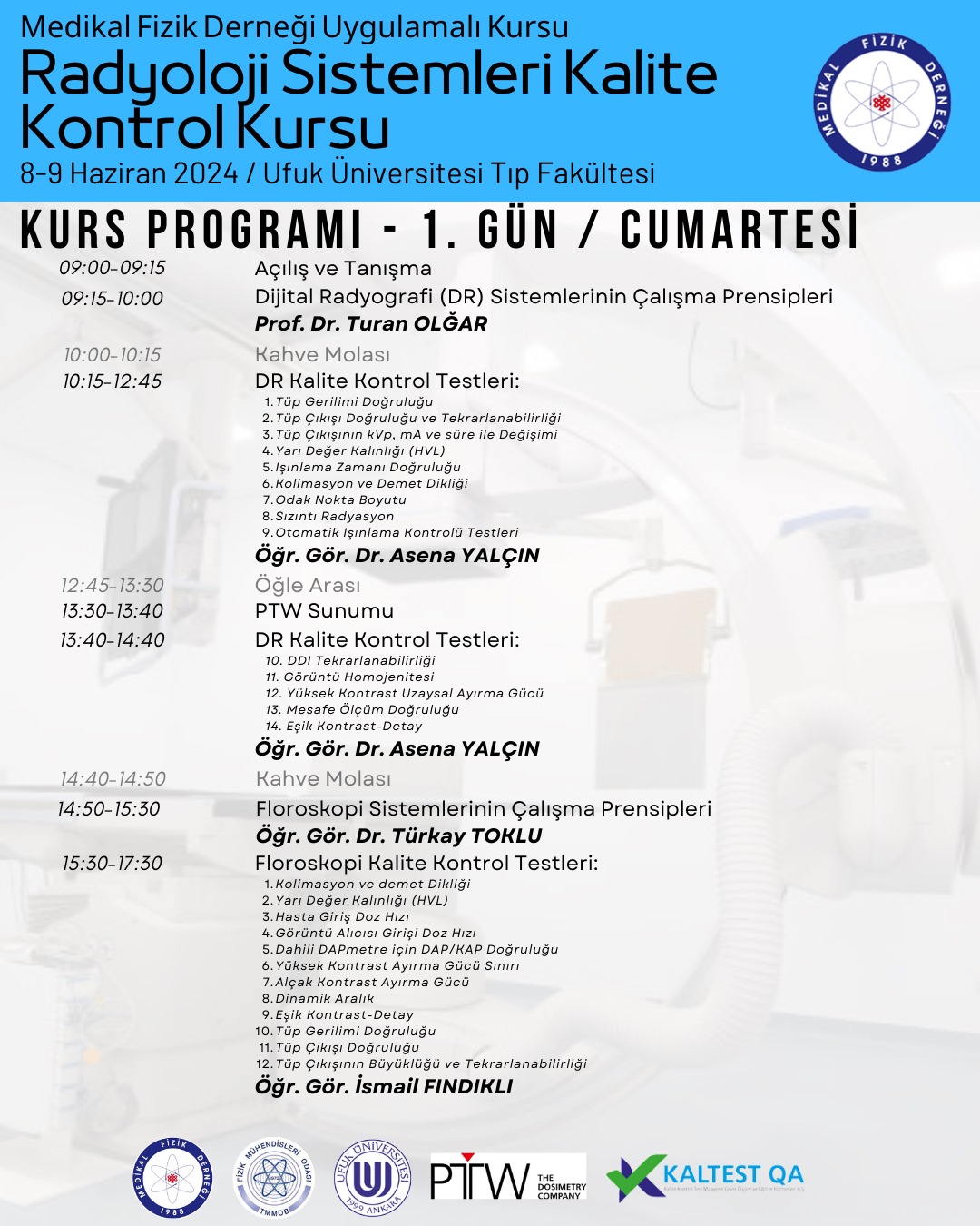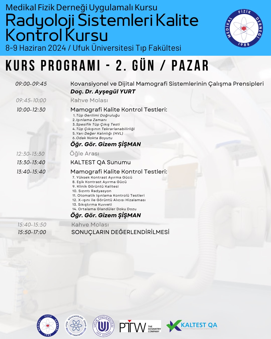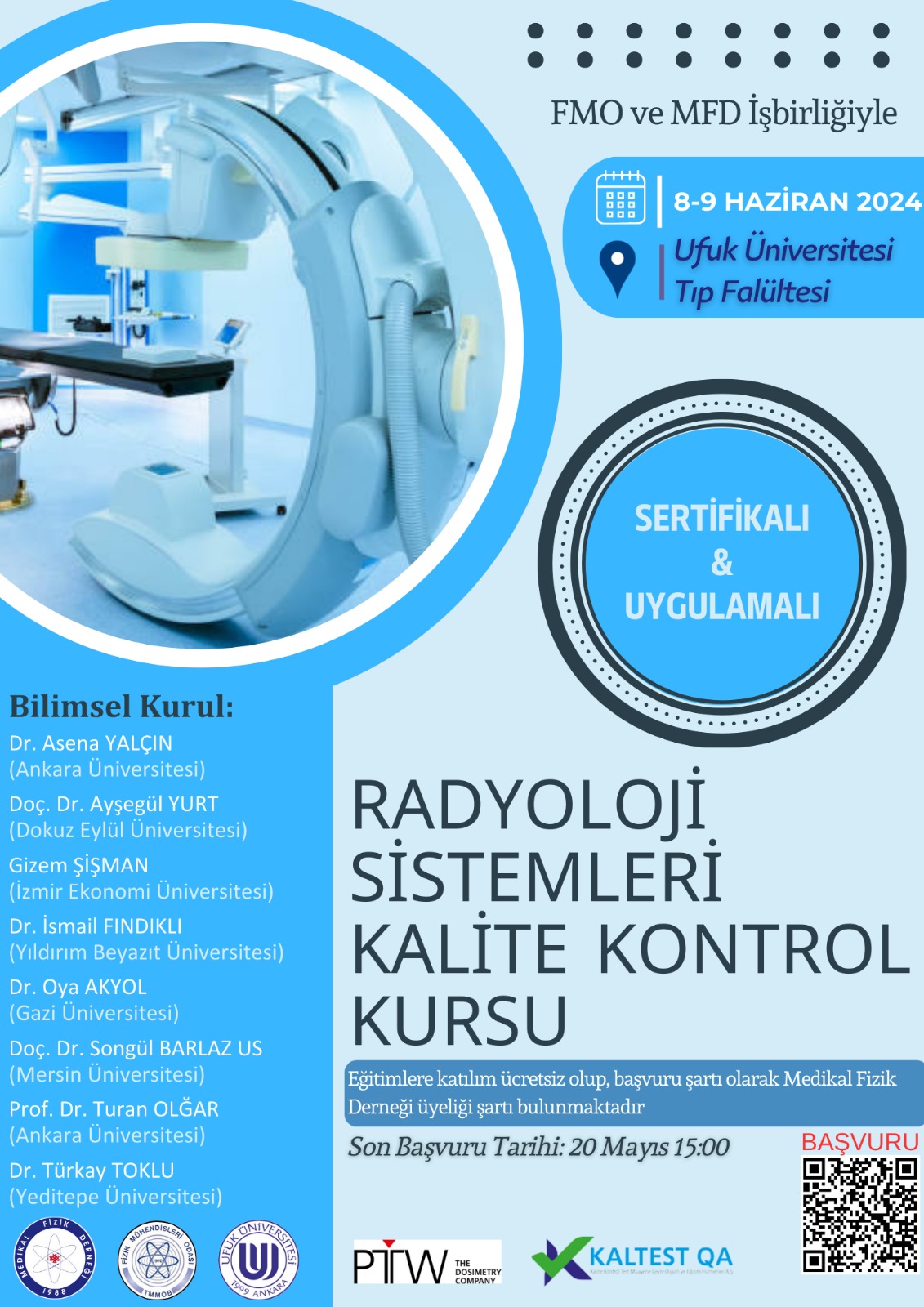 Odamız ve Medikal Fizik Derneğinin 8-9 Haziran 2024 tarihlerinde ortak düzenleyeceği Radyoloji Sistemlerin Kalite Kontrol Kursu Ufuk Üniversitesi işbirliği ile gerçekleştirilecektir.
